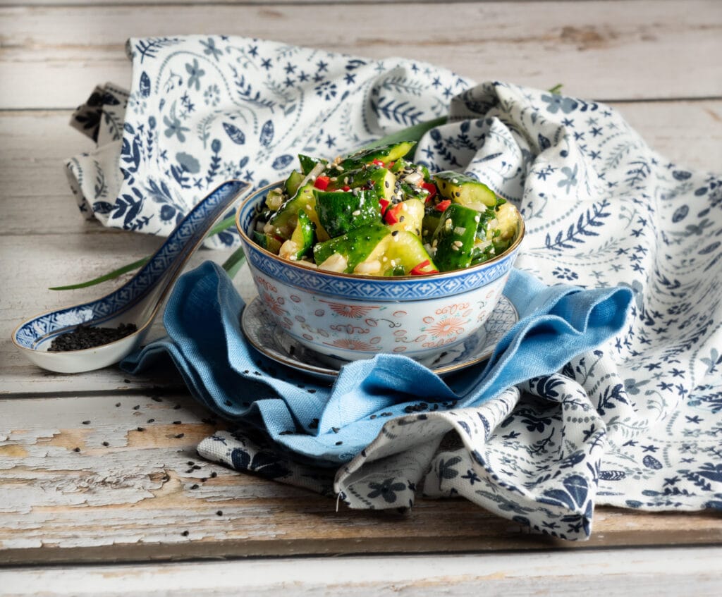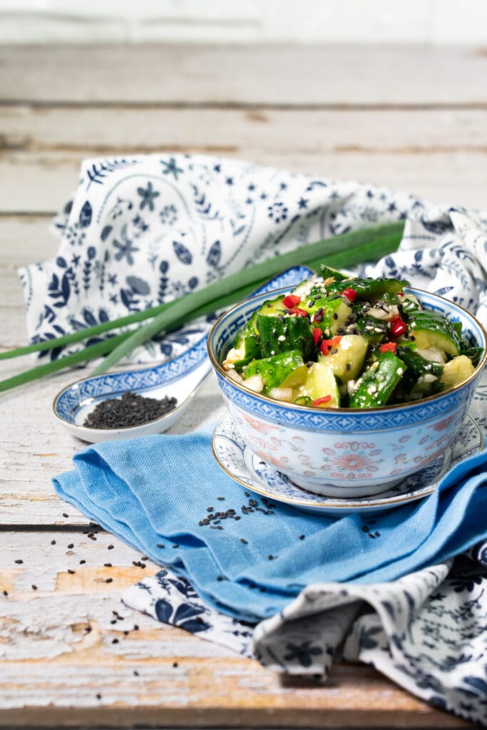 Vürtsikas ja maitsekas salat, mis sobib hästi grillitud liha kõrvale. Siin on maitseks tšillit, ingverit, seesamiseemneid ja röstitud seesamiseemneõli. Kõik see kokku annab ühe mõnusa aasiapärase maitsekombo. Kurgid on purustatud, mitte lõigatud. Purustamine on vajalik sest annab kurgile rohkem struktuuri, et kurk saaks endasse mõnusalt palju maitseid imeda. Kurgi lõikepind on sile ja seetõttu ei haaku see hästi salatikastmega ja kurk ei maitsestu piisavalt. Kurki on hea purustada lihahaamri sileda poolega ning siis lõigata kurgist suupärased tükid.