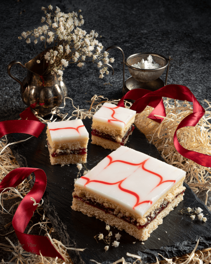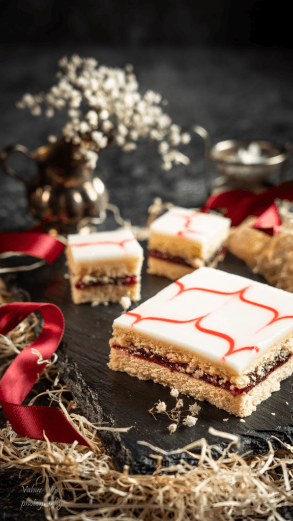 Sega tuhksuhkur vee ja sidunimahlaga ühtlaseks. Võta 1 spl glasuuri ja sega sinna punane toiduvärv. Kalla ja määri valge glasuur jahtunud koogile ning pritsi tordipritsiga valgele glasuurile punase glasuuriga triibud. Võta hambatikk ning vea sellega läbi punaste joonte risti jooned. Vahepeal pühi paberiga tikk puhtaks.