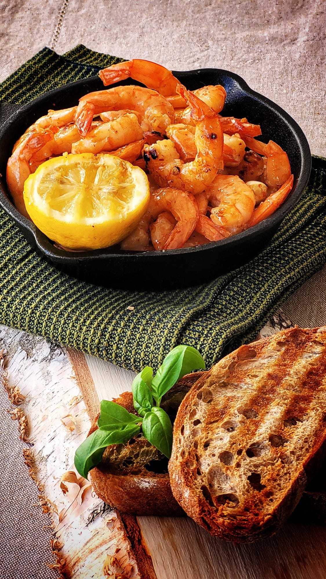 Mõnus vürtiskas eelroog, mis sobib serveerimiseks kolmele. Lisaks paku grillil krõbedaks praetud Ciabattat ja grillitud sidrunit. Vaja läheb: 600 g koorimatta, värskeid krevette soola, musta