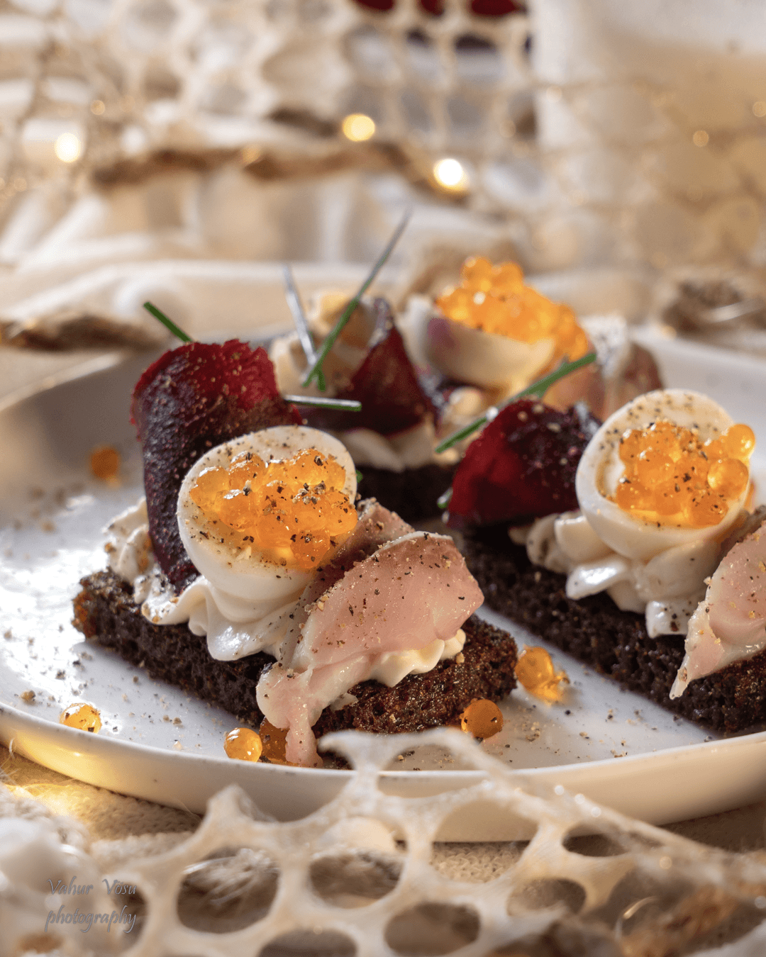 Vaja läheb: 9 muna 100 g majoneesi 1 tl teralist sinepit maitsetsamiseks soola ja purustatud musta pipart 50 g punast kalamarja rohelist murulauku Keeda