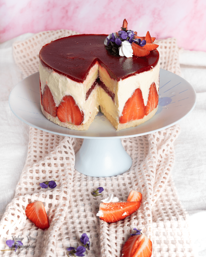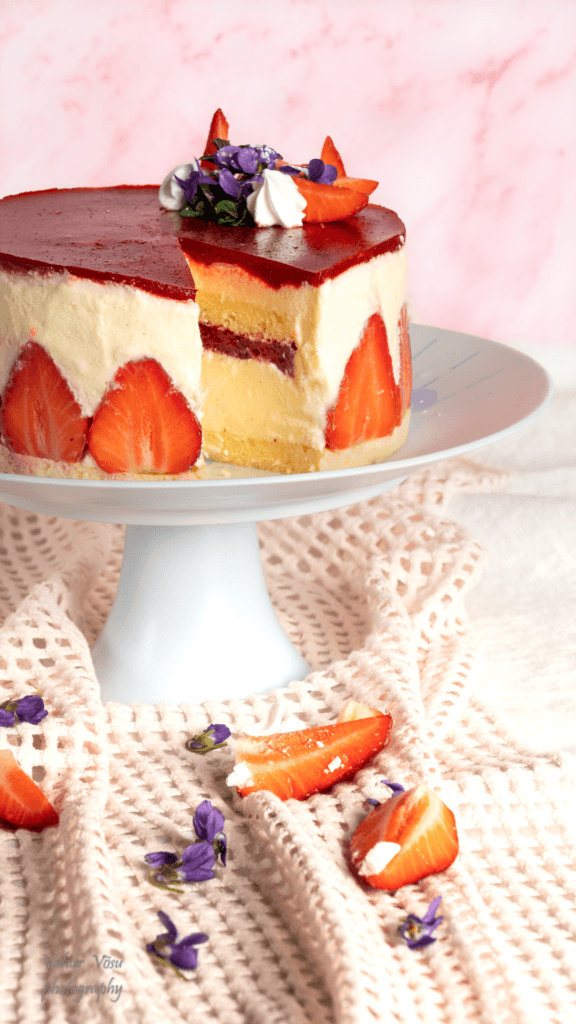 Õhulised-võised biskviidid, maasikatäidis ja pehme mousseline kreem. Imeliselt suvine ja hõrk kook, mis kaunistab emadepäeva lauda.