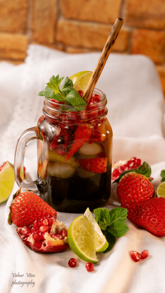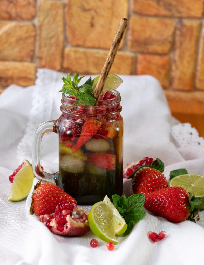 Sega omavahel granaatõuna nektar ja piparmündisiirup. Pane suurtesse klaasidesse (mahuga umbes 400 ml) jää, maasikatükid, apelsinitükid, vaarikad ja granaatõunaseemned. Lisa granaatõuna nektari ja piparmündisiirupi segu. Täida klaas gaseeritud veega ja lisa piparmündilehed ja laimisektorid. Serveeri kohe.