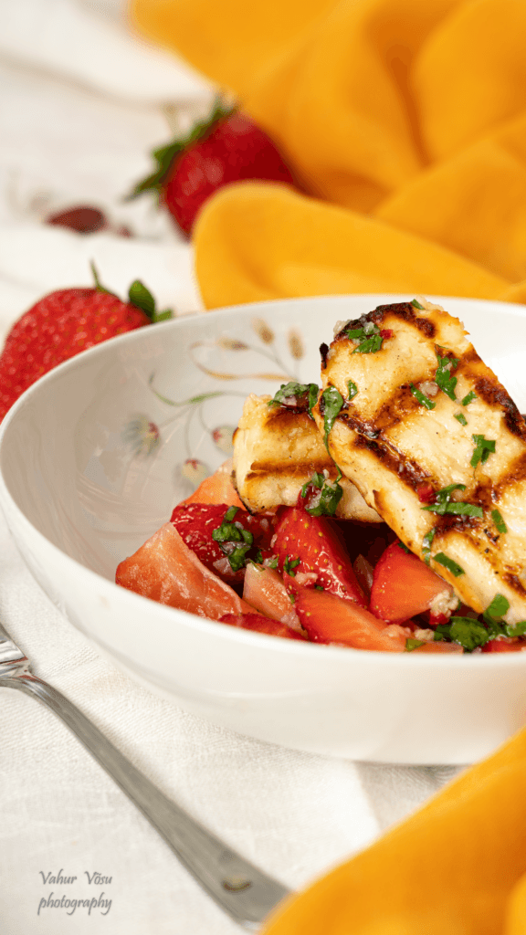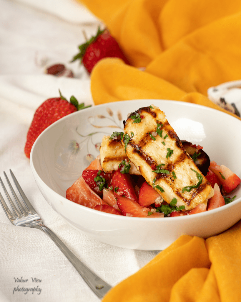 Tõsta maasikatele grillitud juust ning tõsta juustule üle jäänud osa salatikastmest. Serveeri kohe.