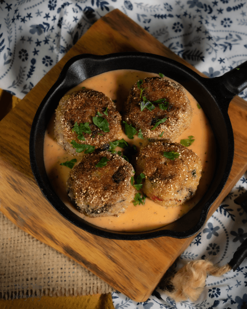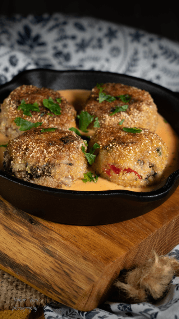 Pane sai veega likku. Tükelda tšillikaun,petersell,  sibul ja seened. Sega omavahel kõik lihapallide koostisosad ning sõtku ühtlaseks taignaks. Kaalu  massist ca 60 g tükid  ja vormi neist käte vahel ilusad pallikesed. Paneeri lihapalle maisimannas.