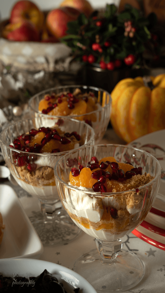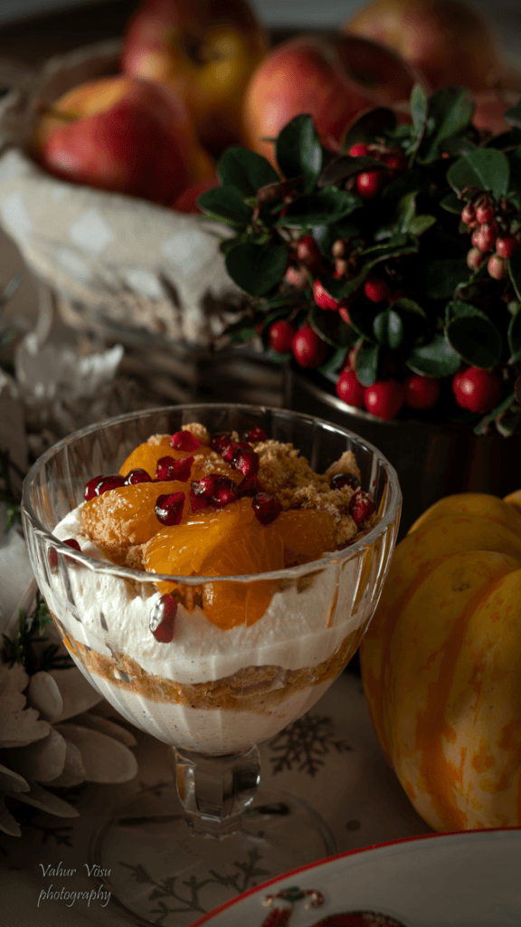 - Pane pool saadud segust magustoidupokaalide (purkide) põhja ning lisa pool mandariinisektoritest ja pool kergelt purustatud piparkookidest