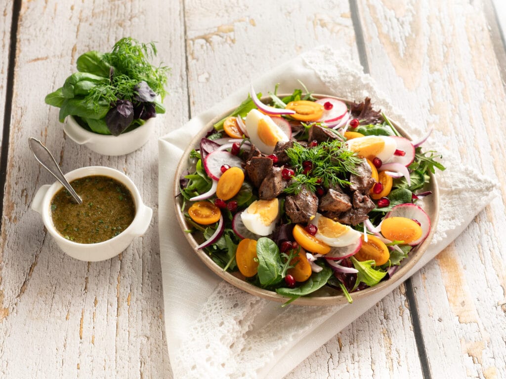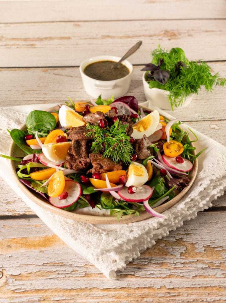 Pese ja puhasta salat ning köögiviljad. Lõika need endale sobivateks tükkideks ning aseta vaagnale. Lisa vaagnale ka veeranditeks lõigatud  keedetud munad ja kanamaks. Kõige lõpuks lisa granaatõunaseemned.
