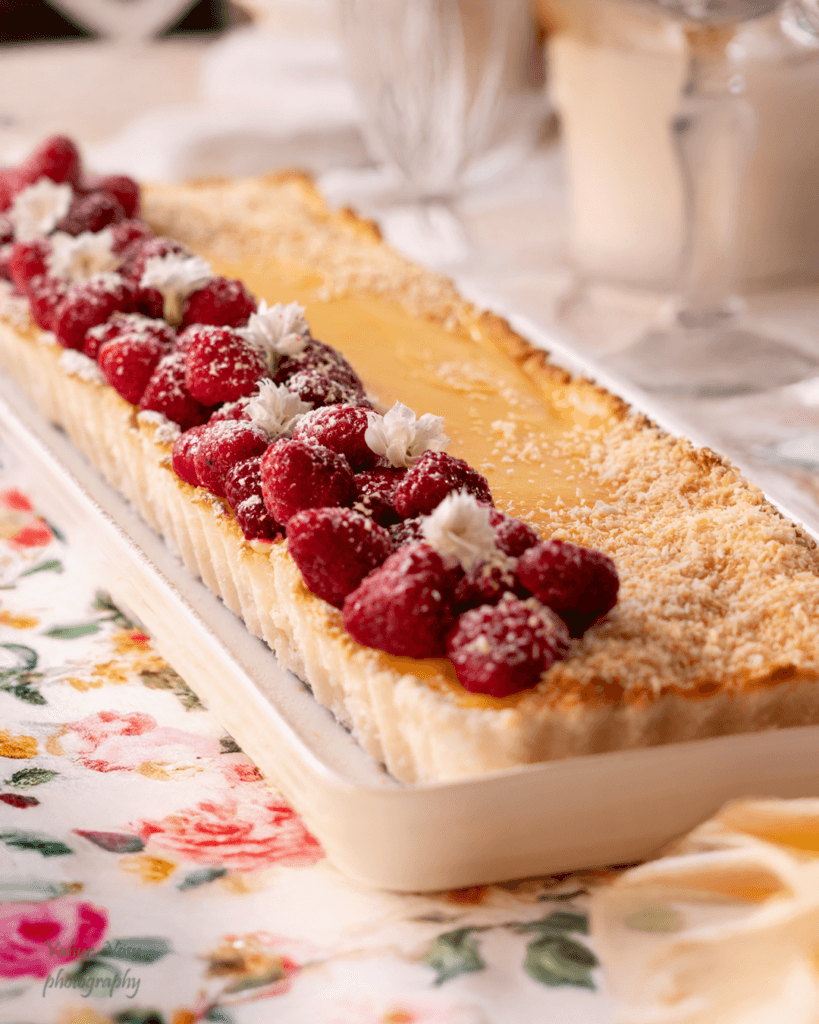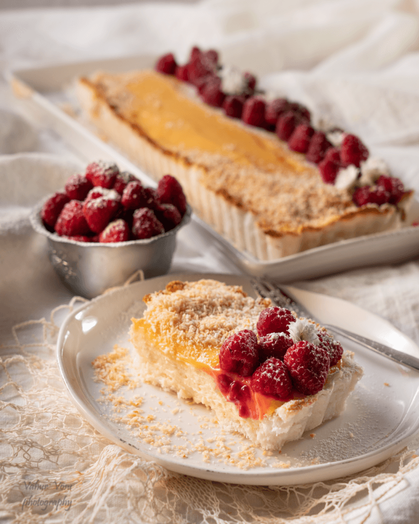 Ilma jahuta kook, milles on kookoshelbeid ja kondenseeritud kookospiima ning granadilli.