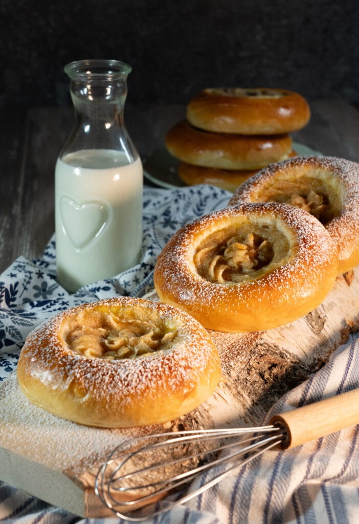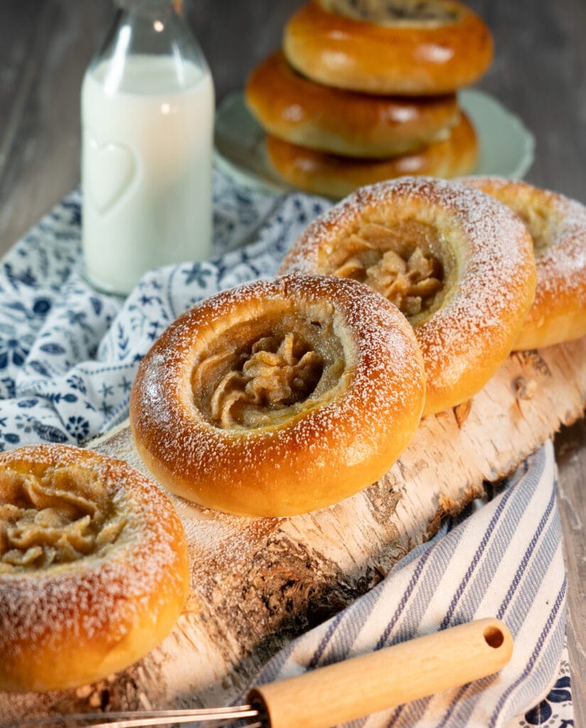Jaga taigen 12-ks võrdseks osaks.  Vormi taignatükkidest ümmargused pallid ning lase neil ahjuplaadil kerkida ca 20 minutit. Vajuta klaasiga kukli sisse süvend. Lisa mannapuder. Määri korpide servad muna-vee seguga.