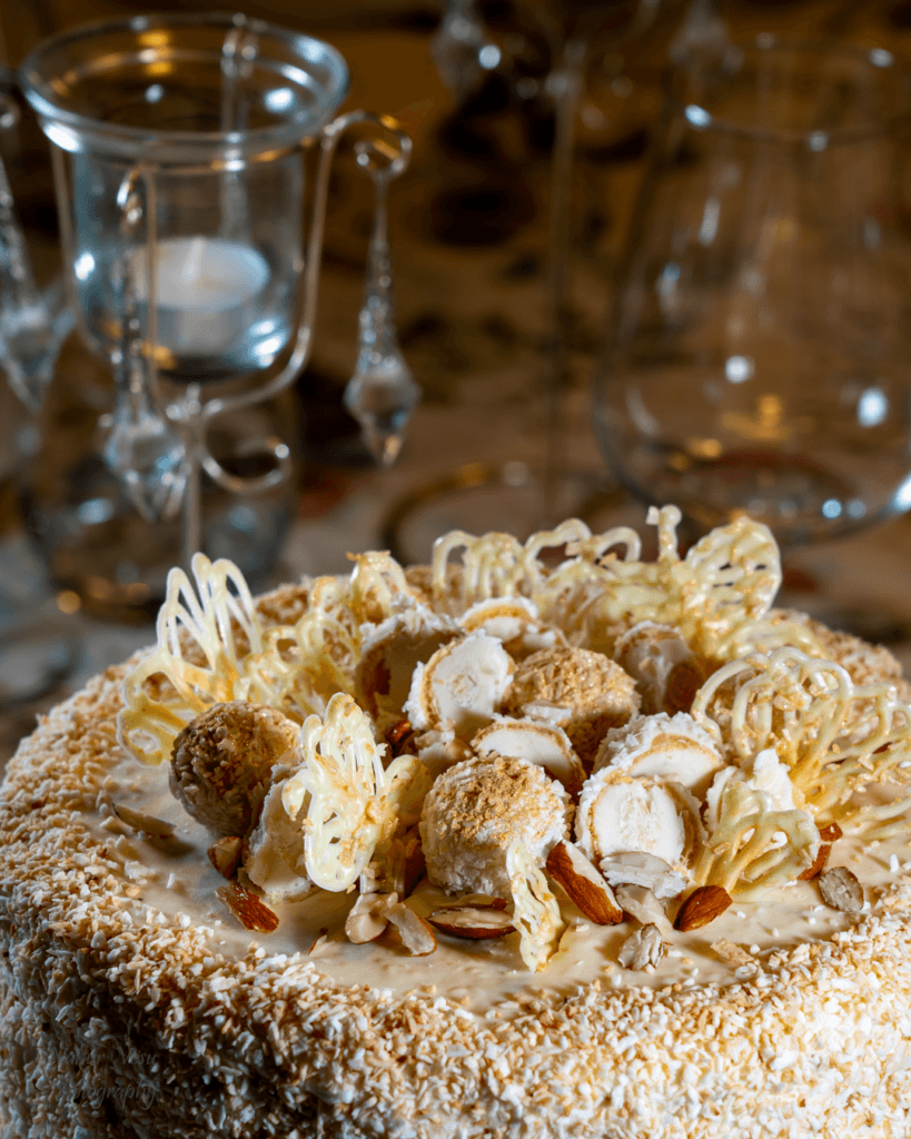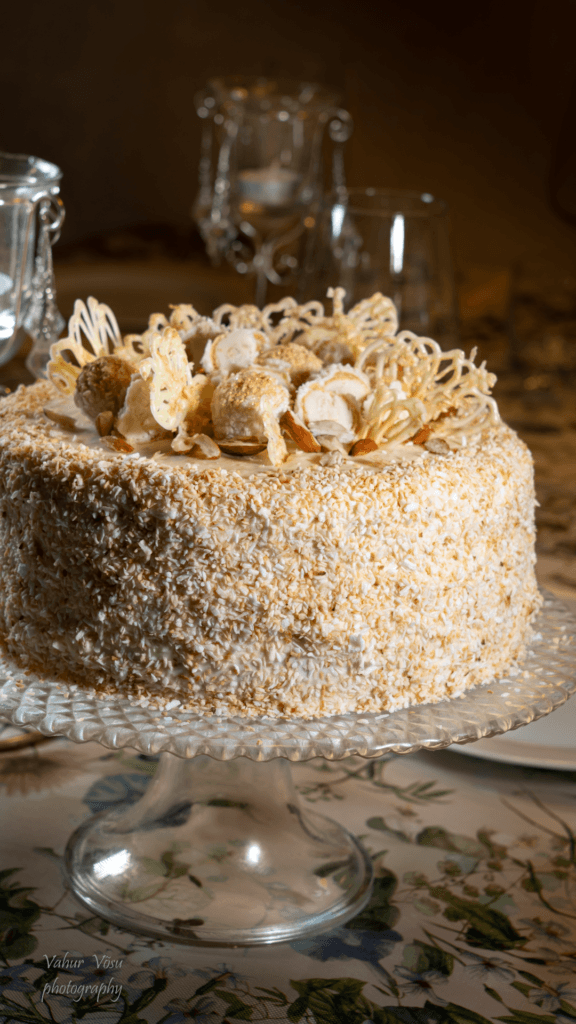 Pane esimene tordipõhja kiht serveerimisalusele ning immuta kookospiimaga. Määri tordipõhjale 1/4 kreemist ning tõsta peale teine kht ja korda sama. Tõsta viimane kiht kreemile ja immuta samuti kookospiimaga ning määri ülejäänud kreemiga koogi küljed ja pealmine osa. Puista koogi külgedele kookoshelbeid. Kaunista kook oma soovile vastavalt ning hoia kooki enne serveerimist külmkapis üleöö.