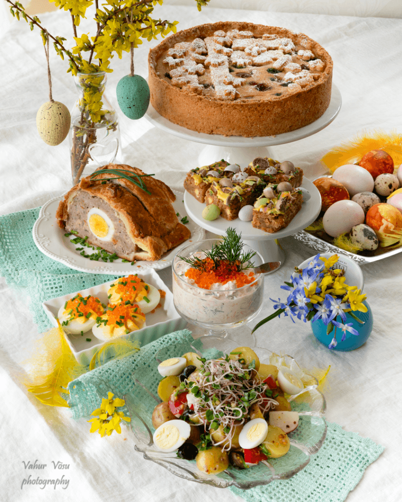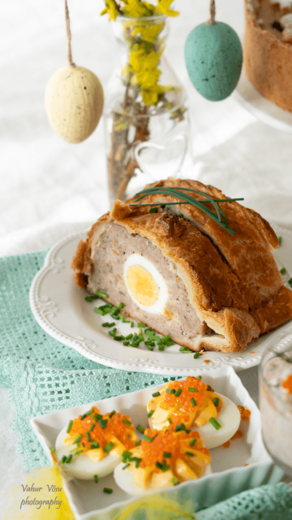 Prantsuse köögist pärit lihavõtte pirukas hakklihast ja keedetud munadest.
