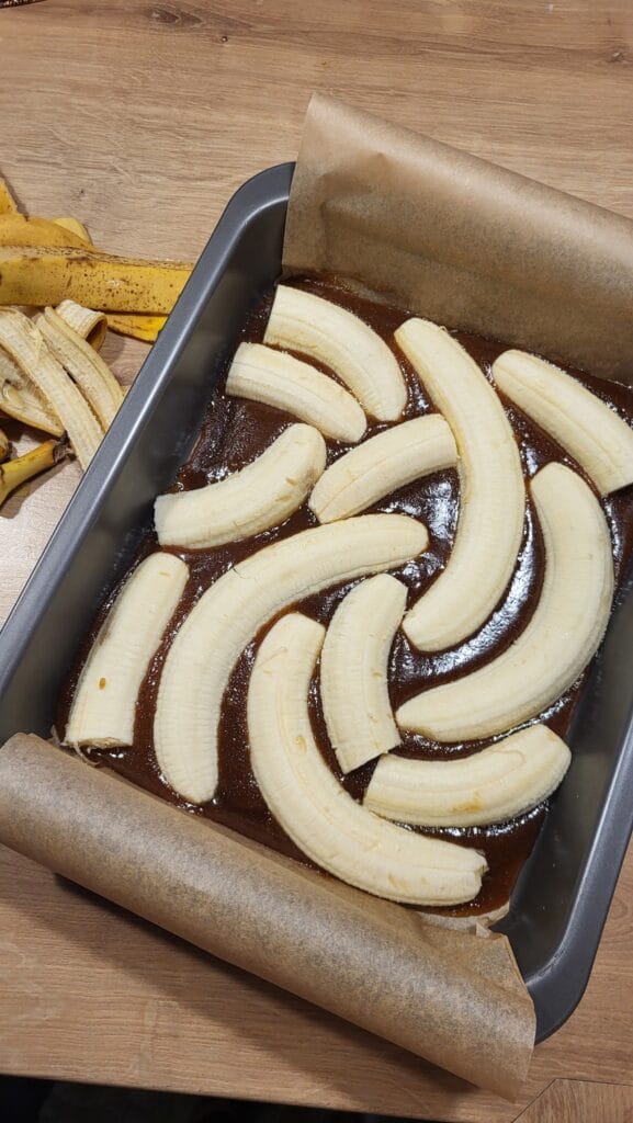 Koori banaanid ja lõika need pikuti pooleks ning aseta need lõikepool all ahjuvormi põhja. Ürita katta terve kook ilusti banaanidega. Tõsta ahjuvorm oma järge ootama.