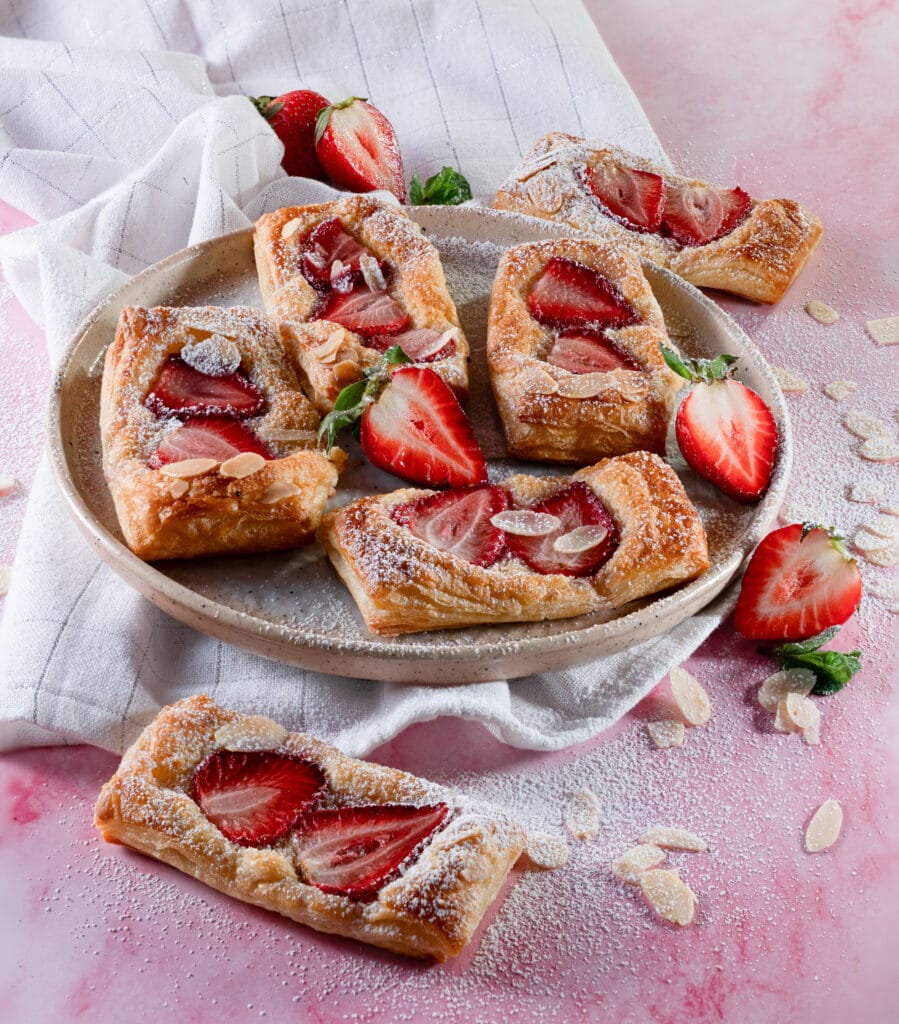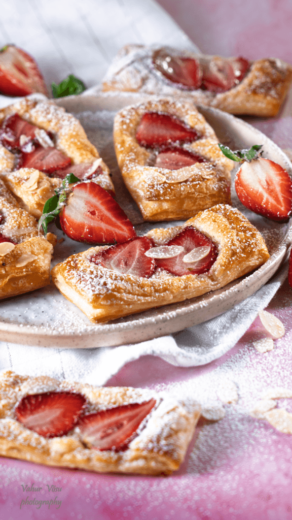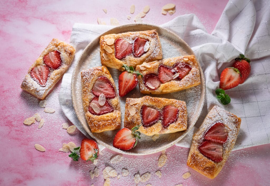 Krõbedad maasikakoogikesed mandlikreemi ja lehttaignaga. Lehttaigen on krõbe ja mandlikreem kreemine ning magus. Mõnusa krõmpsuva nüansi annavad mandlilaastud.