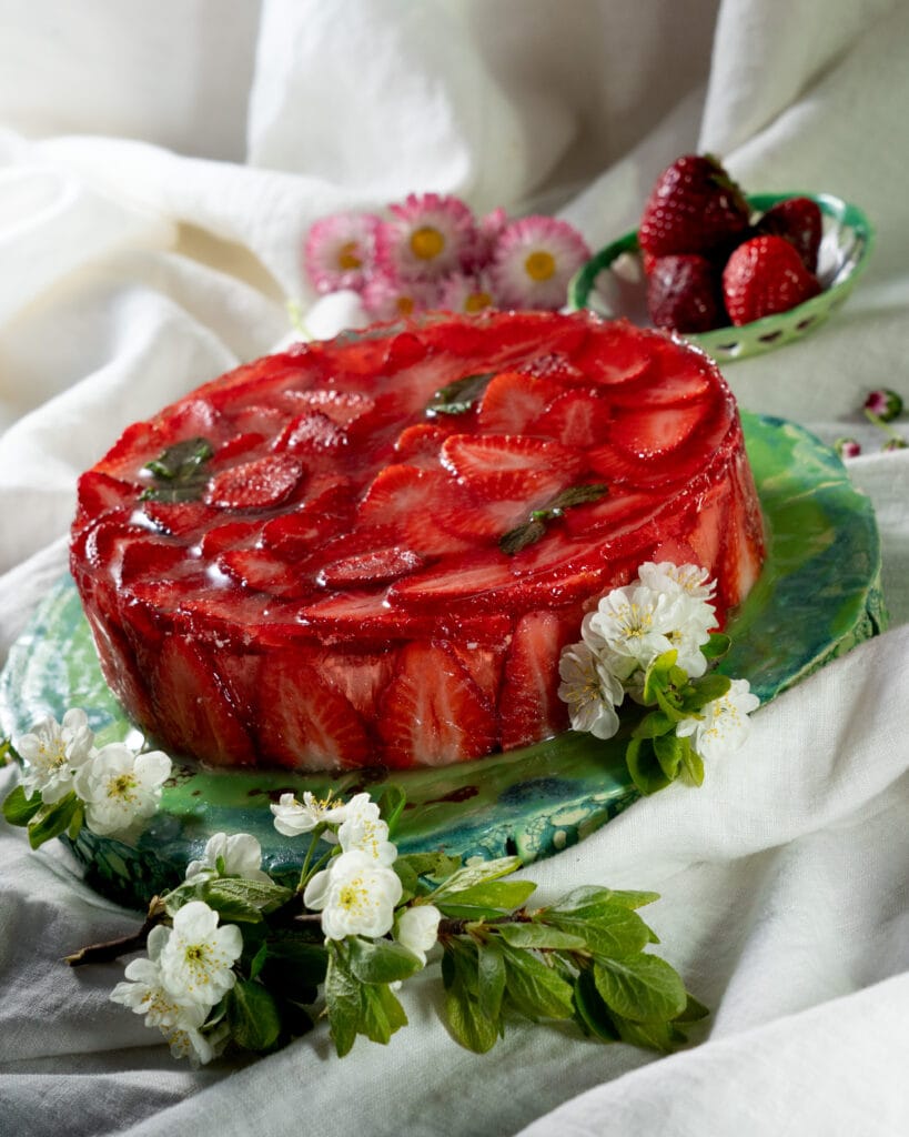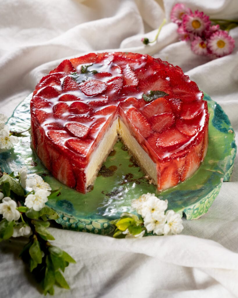 Suvine maasikakook, kus maasikatarretise alla on peidetud Manhattani juustukook.