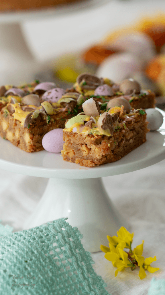 Kaunistuse jaoks sulata šokolaad ja lisa  sellele toiduõli. Jaga saadud segu kolme ossa ning sega igaühte erinev toiduvärv. Võta blondie vormist ning kaunista erinevat värvi šokolaadidega. Kata purustatud šokolaadimunadega ning lase veidi šokolaadil tahkuda. Lõika tükkideks ja serveeri.