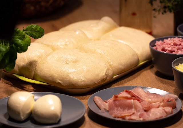 Toskaana toidureisi 2020 retsept nr.26 Pizza taigen Sellest kogusest saad 2 õhukest 35 cm läbimõõduga pizzat. 1 pakk kuivpärmi 240 ml sooja vett 420 g