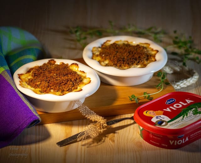 Mac and Cheese (juustune makaronivorm) Valio Viola murulaugu ja koduaiaürtidega sulatatud juustuga 800g keedetud makarone (pasta tüüp Chiffari lisci) 1 sl toiduõli 85 g Alma Eesti