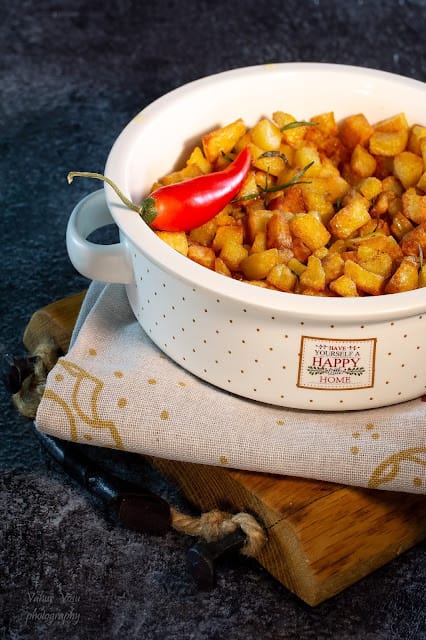 Mõnus lisand erinevatele ahjupraadidele. 800 g kartuleid, lõigatud suupärasetks kuubikuteks 2 sl toiduõli 50 g võid kimbuke rosmariini pisut soola kartulikeeduvette. Keeda kartuleid  ca 5