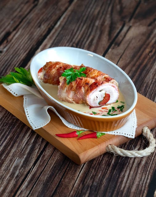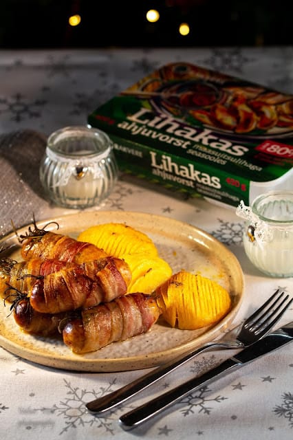 Jõulune roog, mis on mõnus igasse jõuluõhtusööki. Imelihtne valmistada.  Vaja läheb: 8 tk Rakvere Lihakas ahjuvorsti seasooles 8 rosmariini oksa 8 viilu toorsuitsupeekoniviilu 1 sl