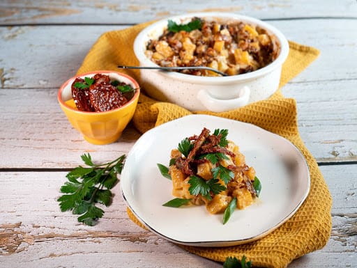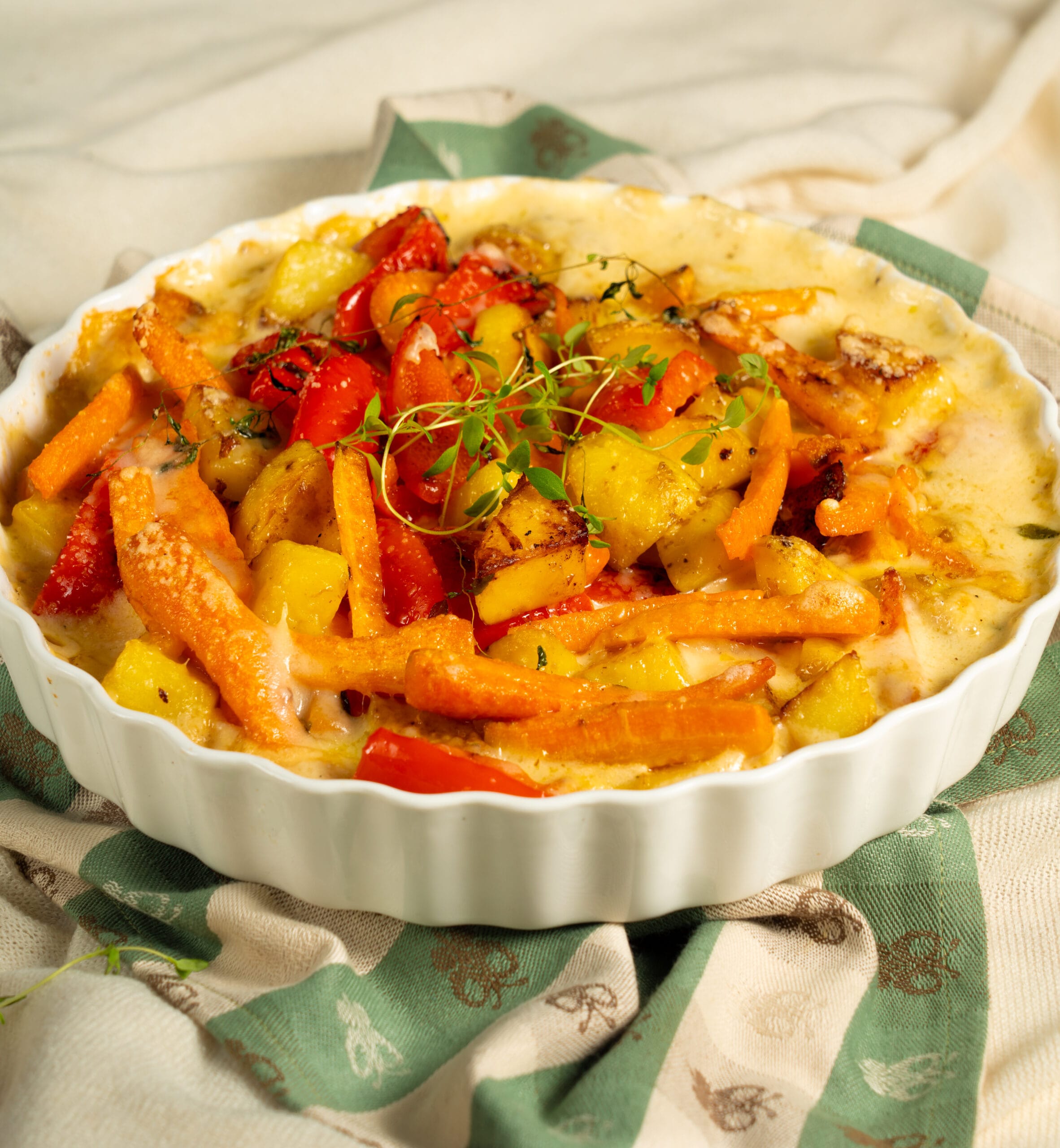 Köögiviljavorm, mis eristub tavalistest ahjuvormidest seetõttu, et köögiviljad on enne ahjupanekut kergelt läbi praetud ja see annab neile kergelt karamellise maitsenüansi. Kastmes olev juust,