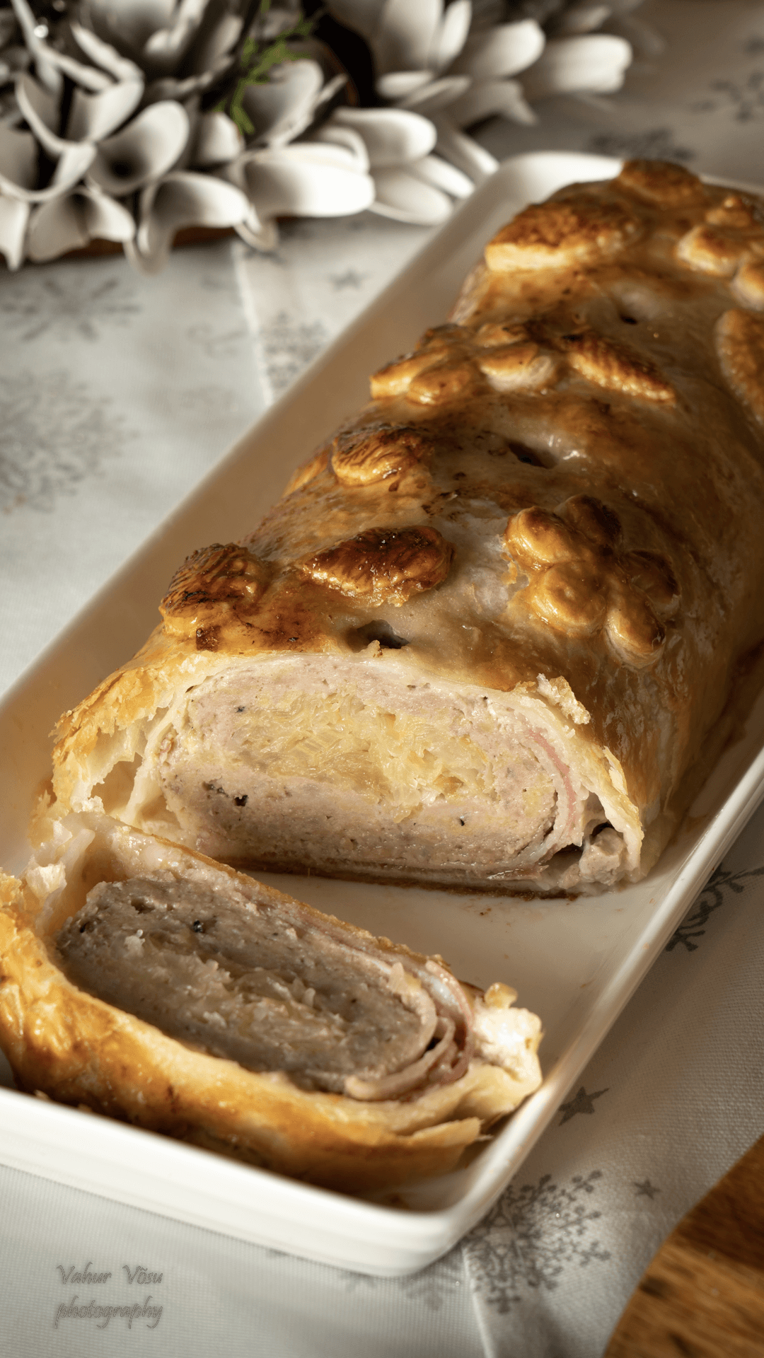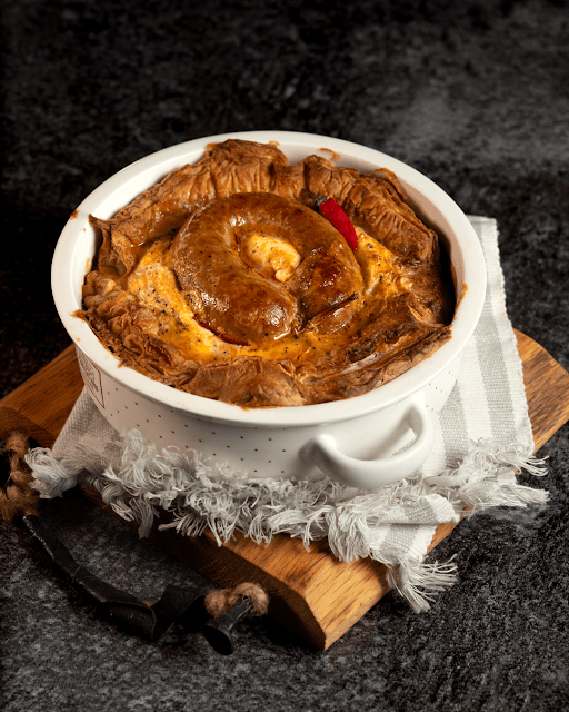 Chorizo ahjuvorstid, mis on praetud pruuniks ja hiljem ahjus küpsetatud lehttaignakoorikus ja mõnusas munatäidises. Chorizo ahjuvorstid tegin ka ise. See oli mul elu teine vorstitegu