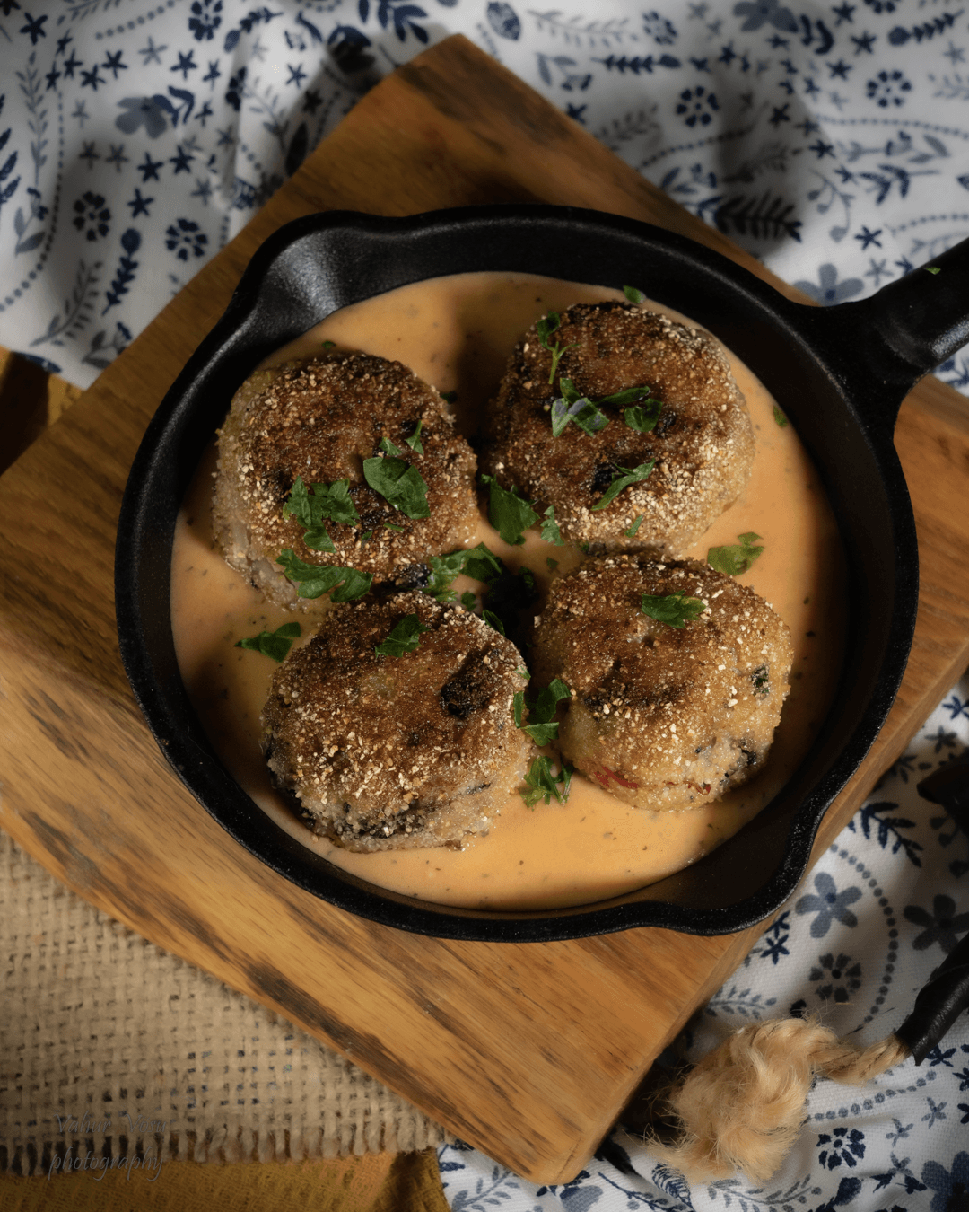 Peet ja porgand annavad kotlettidele kergelt magusa maitse ja teevad kotletid mõnusalt mahlaseks. Maitseks on lisatud veidi tšillihelbeid, et anda kotlettidele ka pisut vürtsikust. Kastmeks