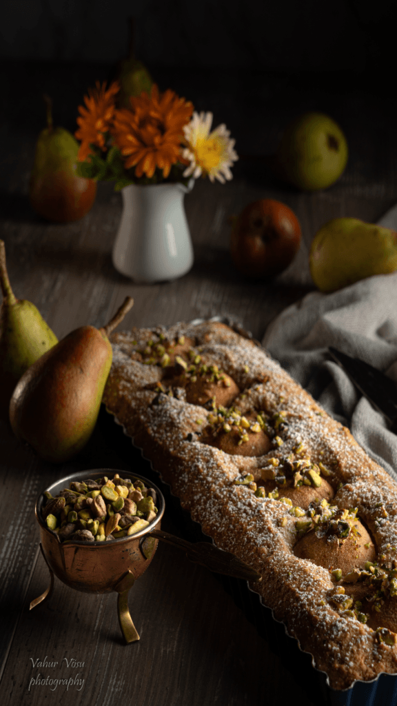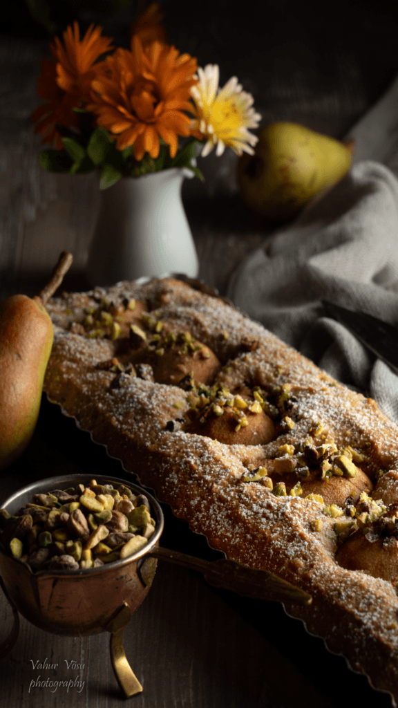 Sügis pakub imelisi võimalusi oma värskete puu- ja köögiviljadega. Seekord olen pirnikoogi lainel. Üks mõnus kooslus, milles on mandlijahu ja pistaatsiapähkleid ja tsipake kardemoni. Mõnus sügisene amps.