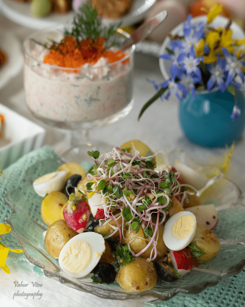 Keeda kartulid  ning jahuta need. Pane suupärasteks tükkideks hakitud redised ja poolitatud kartulid kaussi. Lisa sinna oliivid, lehtpersell  ning keedetud ja pooleks lõigatud munad.