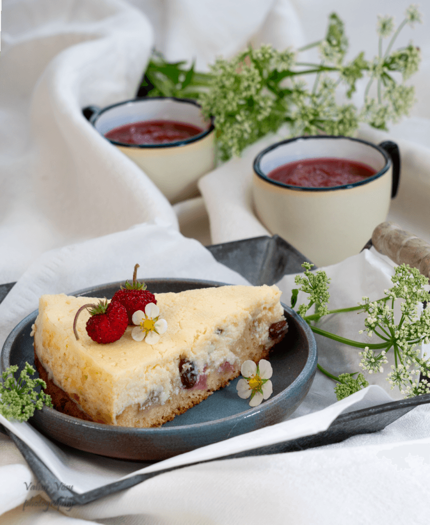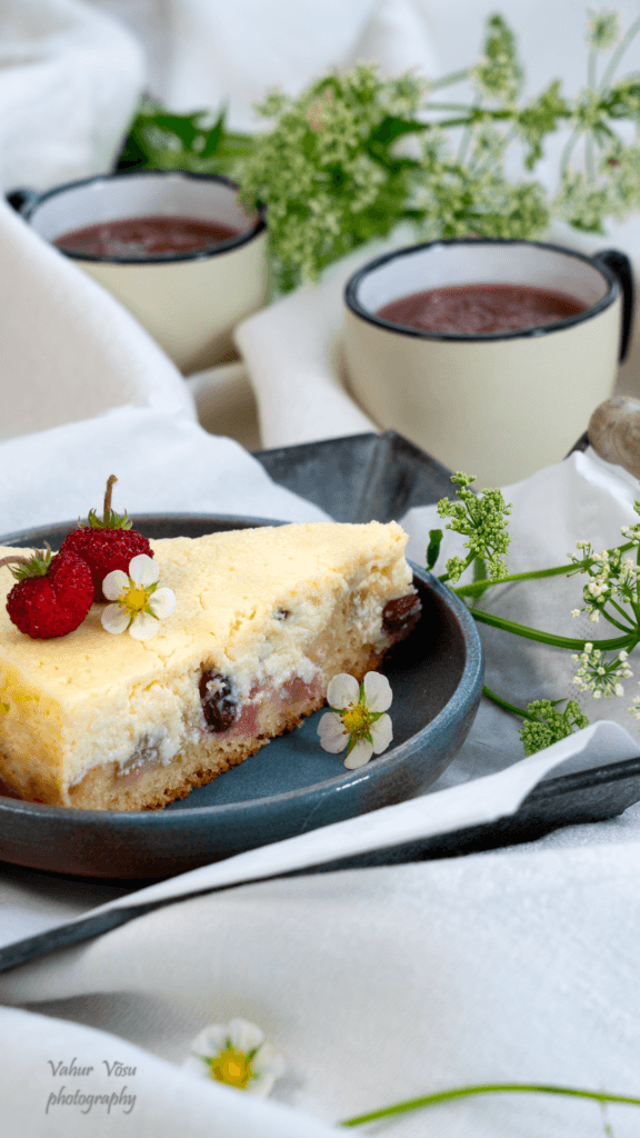 Sega munad, suhkur, sool, vahukoor, ricotta ja rosinad ühtlaseks. Kalla saadud segu eelküpsetatud koogipõhjale ning küpseta kooki veel 190 C juures ca 10-15 minutit. Kooki ei tohi üle küpsetada, täidis peab olema veel kergelt võdisev kui koogi ahjust välja võtad. Lase koogil jahtuda täielikult enne serveerimist. Koogi kõrvale võid serveerida isetehtud rabarberimoosi aga kook sobib imeliselt ka ilma.