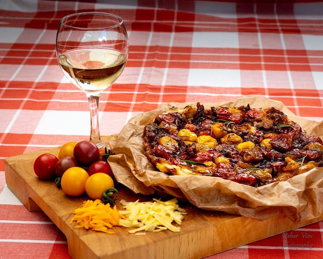 In English Imehea Tarte Tatin koos suviste, magusate kirsstomatitega. Need annavad küpsetisele eriliselt täidlase ja magusa maitse.Koostisosad:250 g tükk lehttaigent500 g värvilisi kirsstomateidsoola pipart2 spl