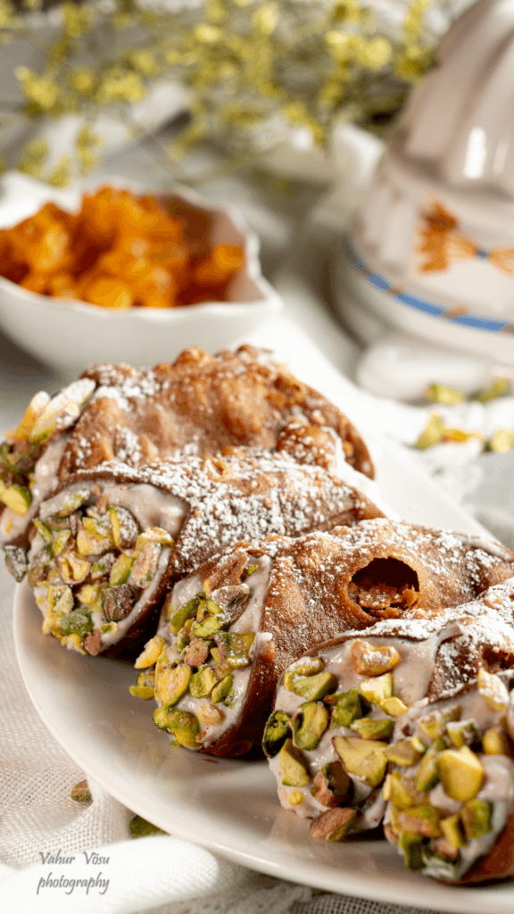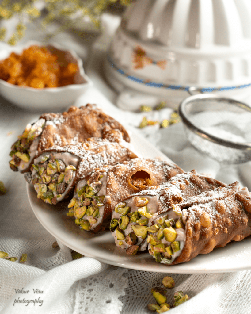 Täida cannoli kestad kreemiga ning kaunista cannoli otsad pistaatsiapähklitega ning rapputa cannolidele kergelt tuhksuhkrut.