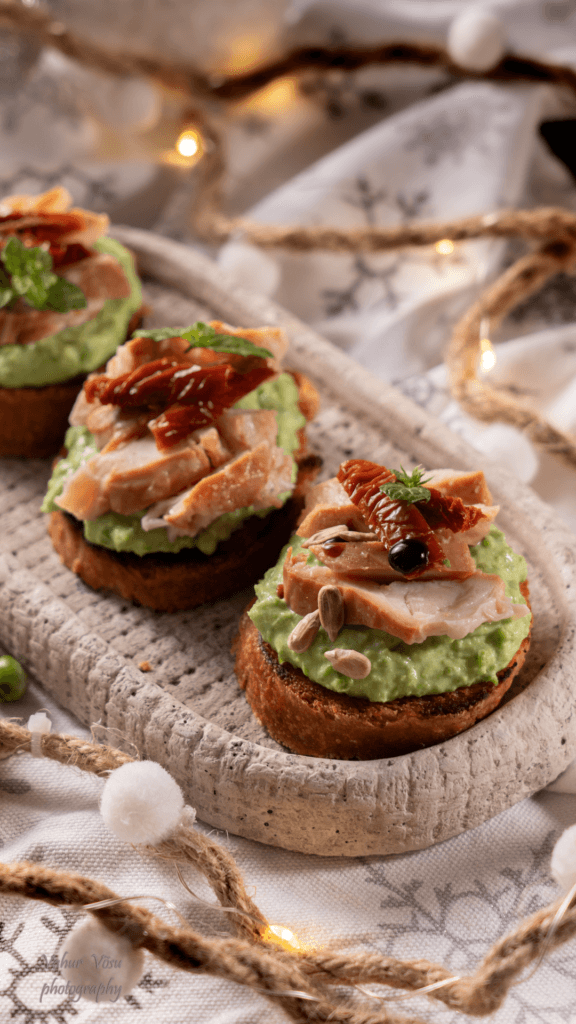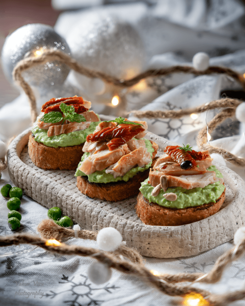 Määri saiaviiludele hernekreem ja pane kreemi peale suitsukanatükid. Kaunista suupisted päikesekuivatatud tomatite, balsamico kreemiga ja päevalilleseemnetega.