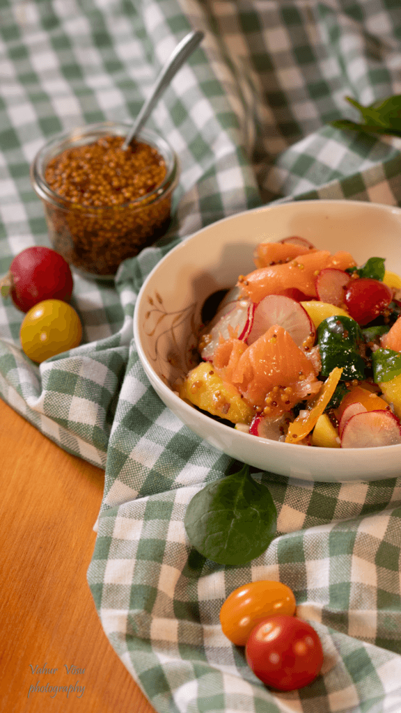 Värskes suvises salatis on kõike mida Eesti suvest leida võib, värsked kartulid ja kurgid, redised ja tomatid. Kõige krooniks on sinepi ja meekaste ning külmsuitsulõhe.