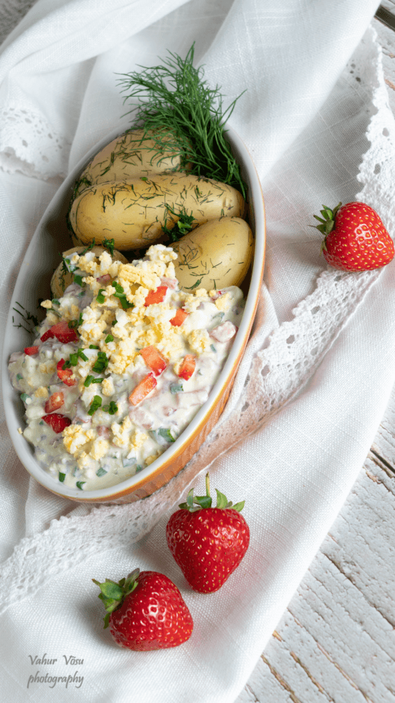Haki roheline sibul, maasikad ja vürtsikilufileed. Suru kahvliga keedetud munad peeneks puruks. Sega oma vahel hapukoor, kodujuust, keedetud muna, vürtsikilufileed, roheline sibul ja maasikad. Lase kastmel maitsestuda vähemalt 1 tund enne serveerimist. Serveeri koos värskelt keedetud kartulitega.